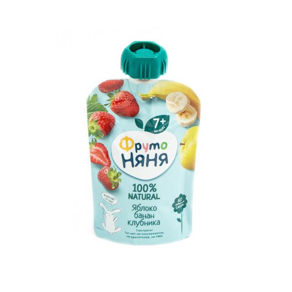 Пюре из яблок, пюре из бананов, сахар, молоко сухое цельное, пюре из клубники, сок из клубники концентрированный, крахмалкукурузный, стабилизатор – пектин, загуститель – камедь ксантановая, аскорбиновая кислота – витамин С, регулятор кислотности –лимонная кислота, вода питьевая.